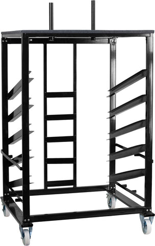 This convenient cocktail table dolly allows you to load all of your pedestal table pieces on one cart. The dolly features sloped shelves that will prevent them from sliding out of the dolly. The upholstered fabric platform top holds your bases and prevents the finish from being scratched. You can easily roll this cart on a truck to transport to different events.