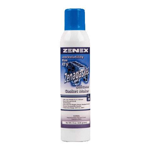 Zenagasket Blue Silicone Gasket Maker - Low Volatility ZENEX IS A single component, room temperature vulcanizing silicone. When applied as a formin-place gasket, it reacts with moisture in the air and cures to a rubber-like product. FEATURES AND BENEFITS 100% RTV Silicone. Industrial strength. Caulks around tubs, sinks, and showers. Temperature range from -60°F to 500°F. Insulates electrical components. Seals around windows, doors, and walls. Binds most materials, similar or dissimilar (glass, wood, metal, rubber, plastic, ceramics, etc.). APPLICATIONS AND USES Zenagasket will adhere to clean metal, glass, most types of wood, silicone resin, vulcanized rubber, ceramic, natural and synthetic fiber as well as painted and plastic surfaces. Forms in-place gaskets for oil and transmission pans, oil and water pumps, valve and timing chain covers, electric motors and electric control boxes, gear boxes, compressors, and machine covers. DIRECTIONS FOR USE Surface must be clean, dry, and free of oil, tar, dirt and dust for best adhesion. Hold can at a 45° angle and apply a continuous bead of 1/16” to 1/8” to the mating surface, encircling all bolt holes. For adhesion to both parts, assemble immediately. For one part adhesion, allow 10 to 15 minutes for bead to skin. Assemble parts, but do not squeeze gasket out by over tightening bolts. Starts to cure immediately, fully cures in 24 hours and reaches optimum strength in 7 days. Leave a small bead of material which will form a sealing “plug” for reuse. To use, gently pull “plug” and begin to use material. If plug breaks leaving the dispensing tip sealed, us